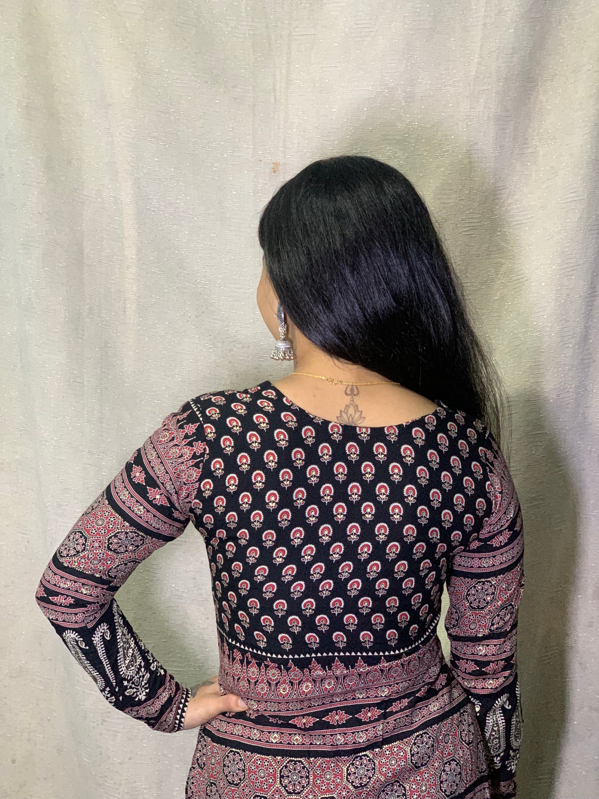 Elevate your ethnic wardrobe with Kuhoo’s Siyahi Muslin Cotton Kurthi, a piece that blends comfort with charm. Made from premium muslin cotton with soft lining cloth, this kurthi features intricate block-inspired motifs in maroon and beige over a striking black base. The V-neckline with full sleeves adds sophistication, while the straight silhouette with side slits makes it versatile for festive occasions or casual elegance.